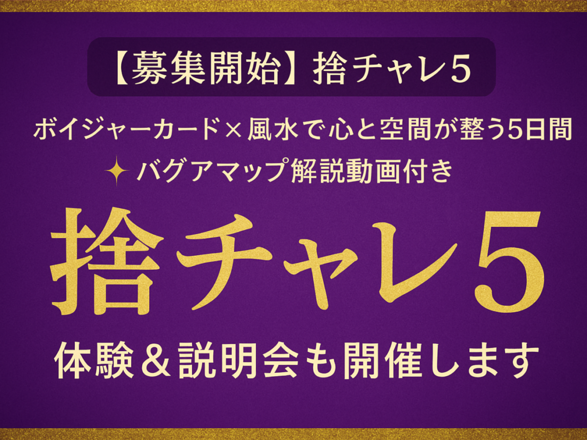 【募集開始】捨てチャレ5 \ボイジャーカード×風水で心と空間が整う5日間/ ✨バグアマップ解説動画付き✨ 体験&説明会も開催します こんにちは。三好えみです。 お待たせしました! 「捨てたい」「変わりたい」「軽くなりたい」を叶える、 5日間の捨て活チャレンジ【捨てチャレ5】のご案...