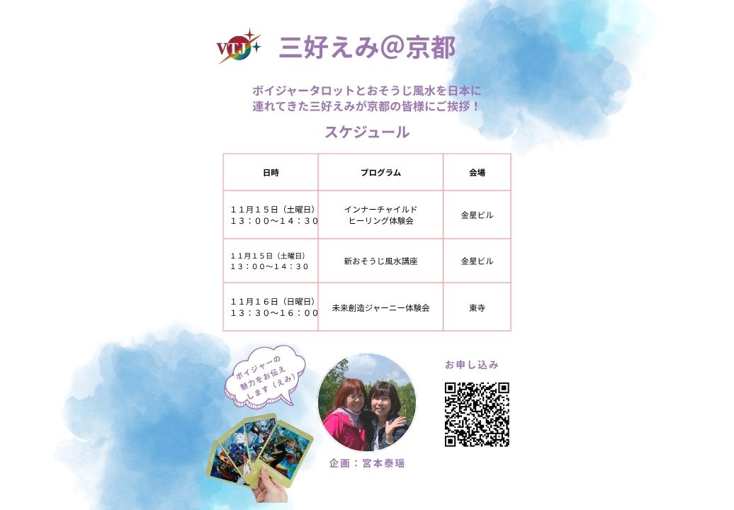 こんにちは、三好えみです。 11月は京都と宝塚にお邪魔します。 マスター ティーチャーの宮本 泰瑶さんと 同じく マスターティーチャーの井上理映子さんがが招待してくれたのです。 11月15日、16日は京都にて 1、「インナーチャイルド講座」 2、「おそうじ風水講座」 3、お散歩ボイジャー の3つの プログラ...